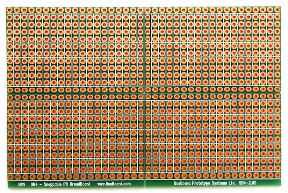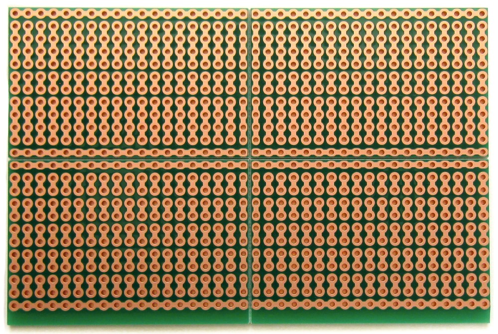 Each of the four smaller boards has two power rails. There are bonus two-hole pads along the centerline allowing DIL (dual in-line) headers to be used (some boards leave that area empty). A top-side silkscreen helps to position components.