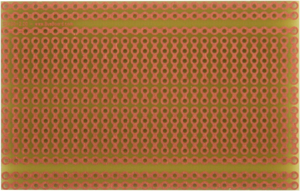 The SB400 Solderable PC BreadBoard enables you to transfer your circuit and wires from a plug-in breadboard without recutting wires or changing your layout. The SB400 has the same pattern and spacing as a standard 400 connection point BB400 solderless plug-in breadboard. It has a standard 5-hole strip for each IC pin, just like solderless breadboards plus 4 power rails. However, it has the advantage that soldered joints provide a more reliable long-term connection than solderless contacts. The SB400 has four power rails like solderless breadboards, plus two bonus rails for power or signals. There are bonus two-hole pads along the centerline allowing DIL (dual in-line) headers to be used. BPS prototyping boards use high-quality FR4 glass epoxy PCBs for long life, with an anti-tarnish protective coating for easy soldering. BPS boards are lead-free and RoHS compatible.