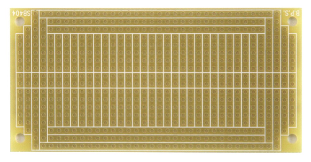The SB404 Solderable PC BreadBoard enables you to transfer your circuit and wires from a plug-in breadboard without recutting wires or changing your layout. The SB404 has the same pattern as a standard 400 connection point BB400 solderless plug-in breadboard. It has a standard 5-hole strip for each IC pin, just like solderless breadboards plus 4 power rails. However, it has the advantage that soldered joints provide a more reliable long-term connection than solderless contacts. The SB404 has four power rails like solderless breadboards, plus two bonus rails for power or signals. There are bonus two-hole pads along the centerline allowing DIL (dual in-line) headers to be used. A top side silkscreen helps to position components. Four mounting holes allow your projects to be secured. BPS prototyping boards use high-quality FR4 glass epoxy PCBs for long life. An anti-tarnish coating protects the copper for a long shelf-life and provides easy soldering. BPS boards are lead-free and RoHS compatible.