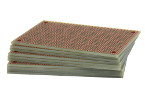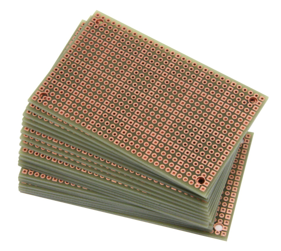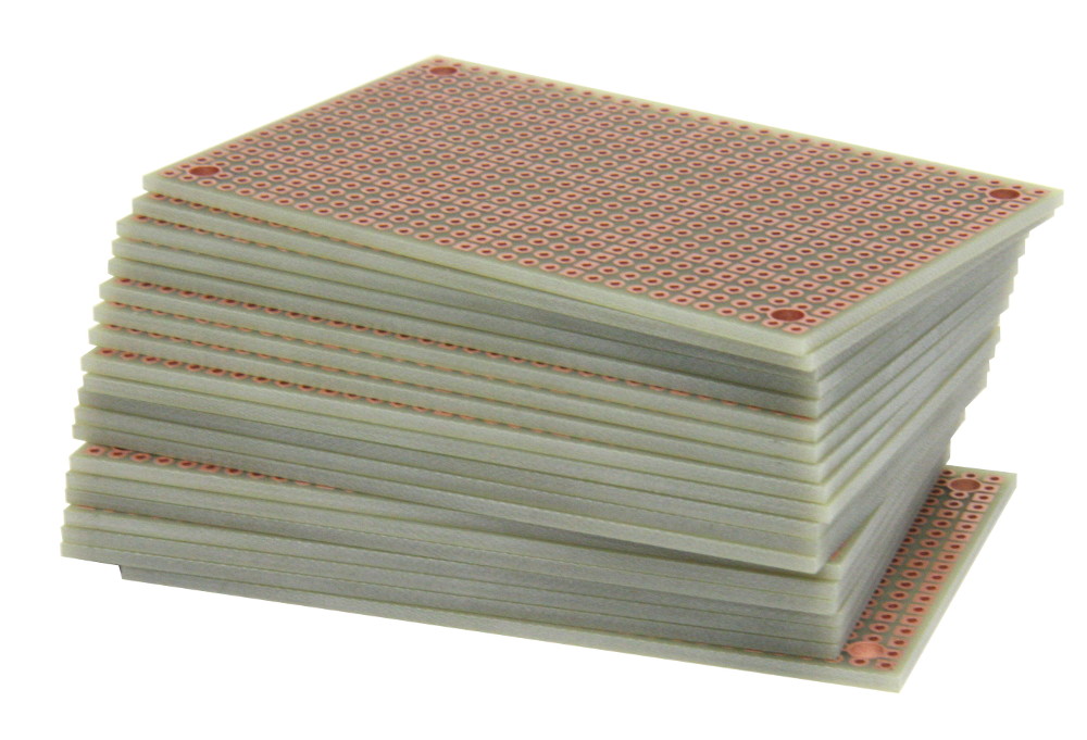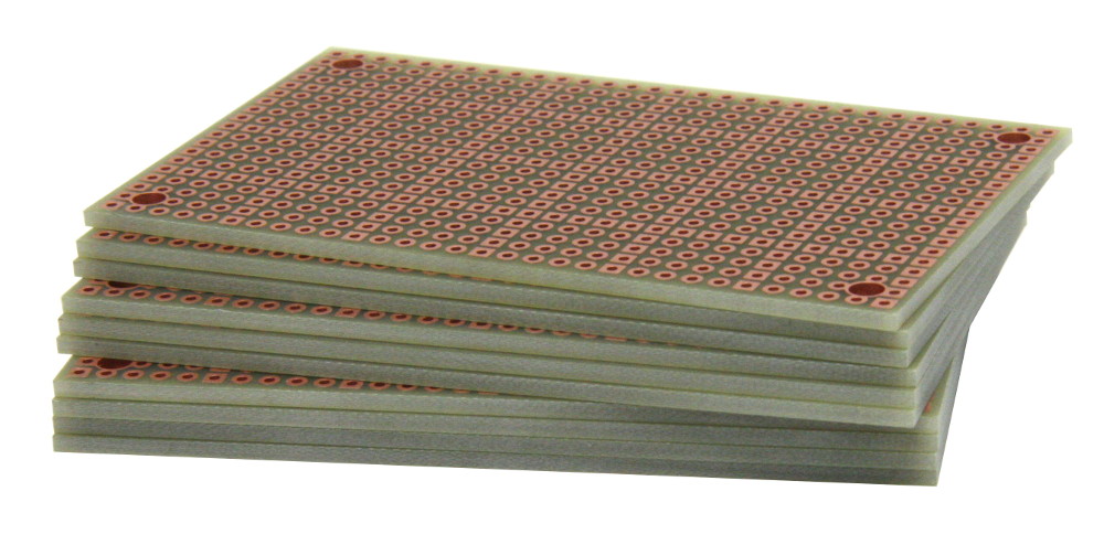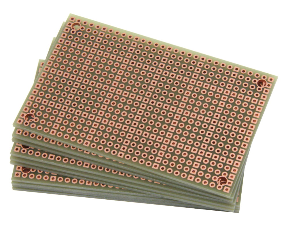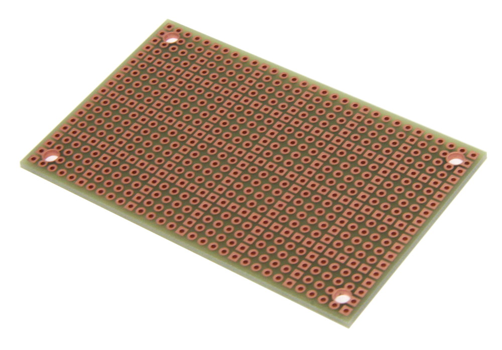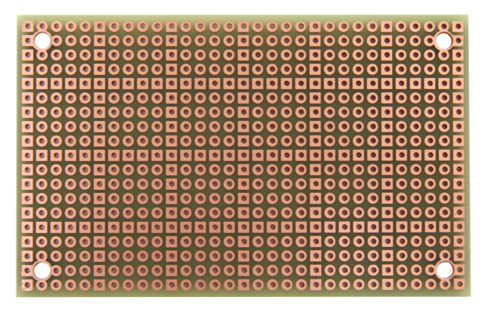 - Pad-per-hole prototyping board with plated-thru holes. A square pad every 5th hole makes it easy to align components on top and bottom.