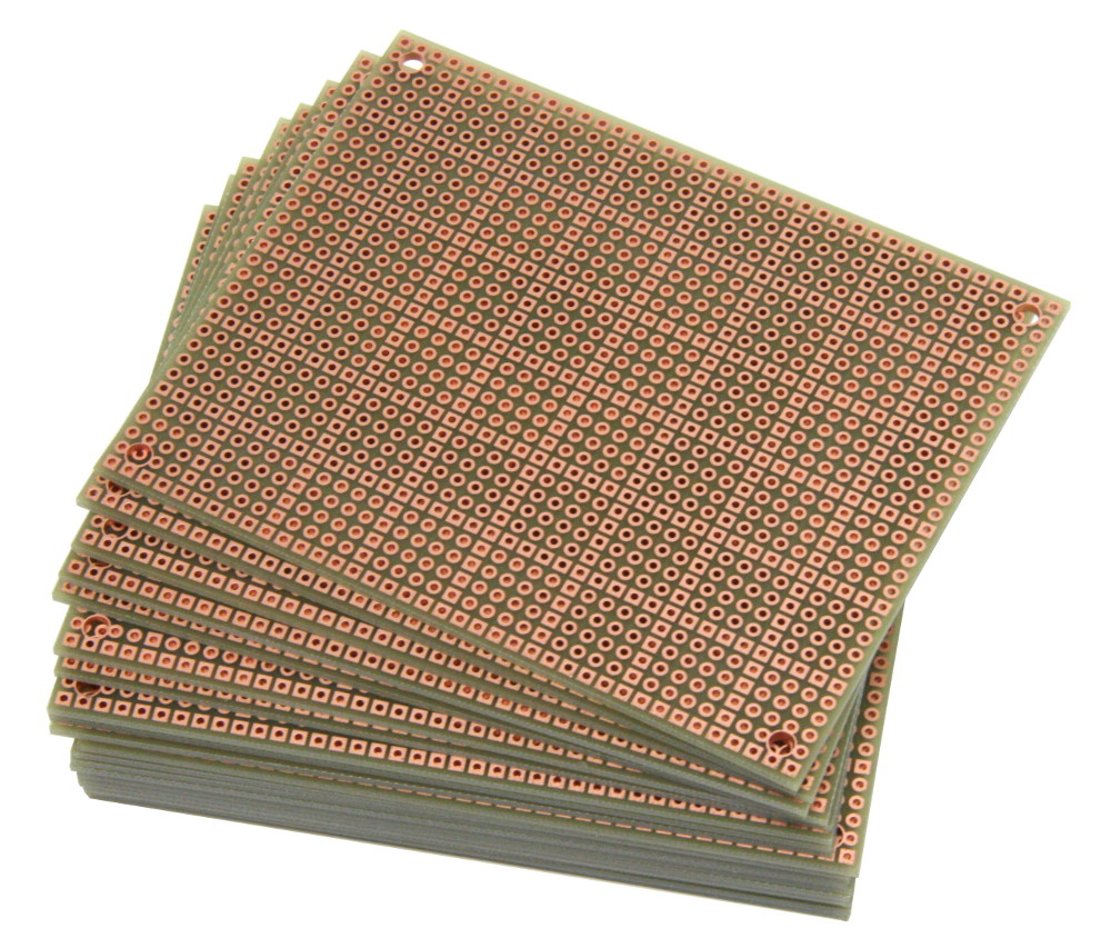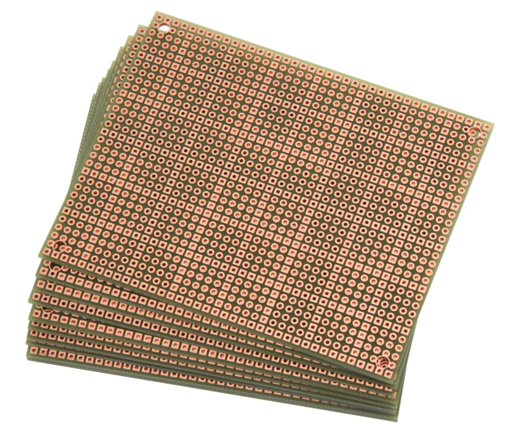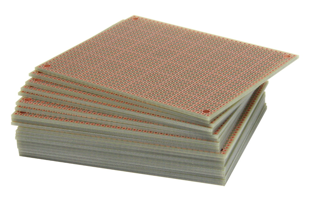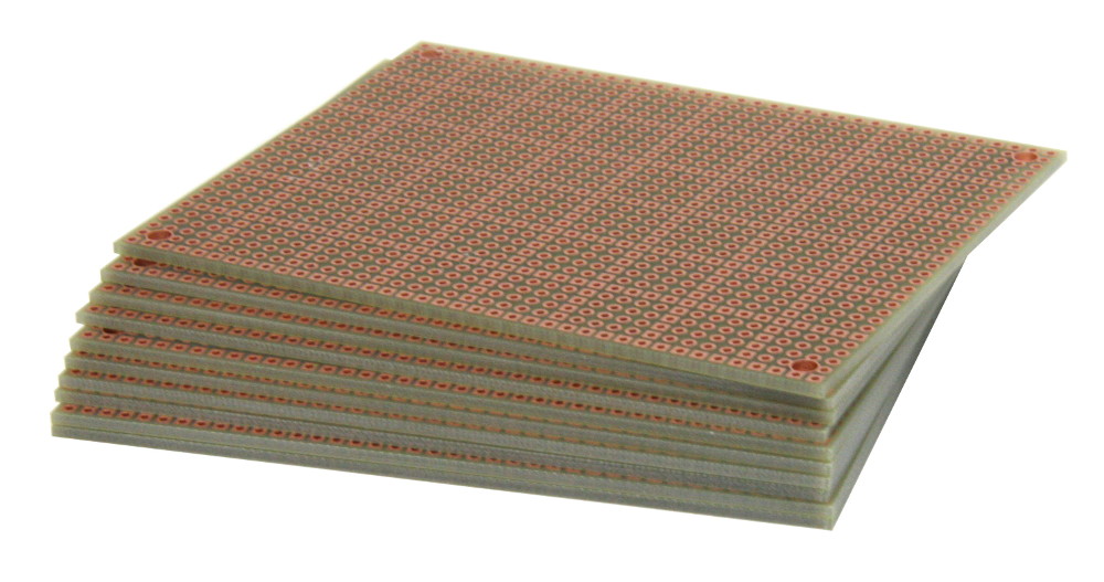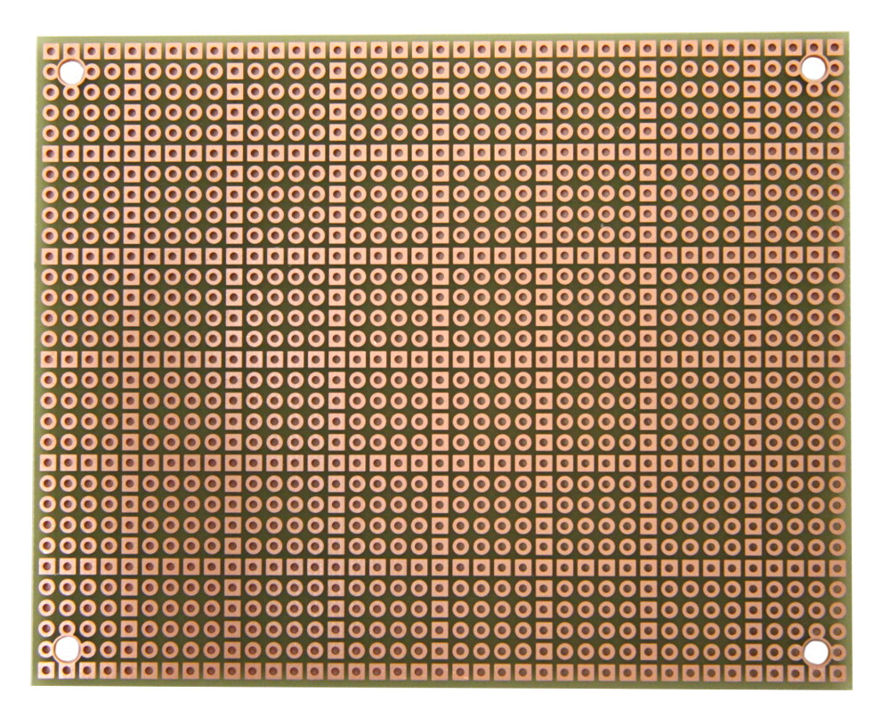 • Pad-per-hole prototyping board with plated-thru holes. A square pad every 5th hole makes it easy to align components on top and bottom.
