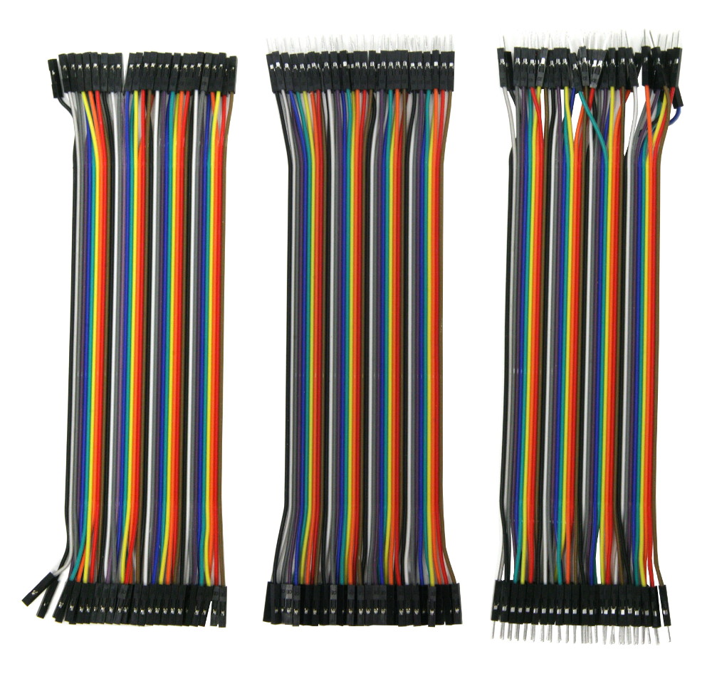 - Multi-color ribbons of 40 wires with male-male, female-female, or male-female connectors in 20cm lengths.